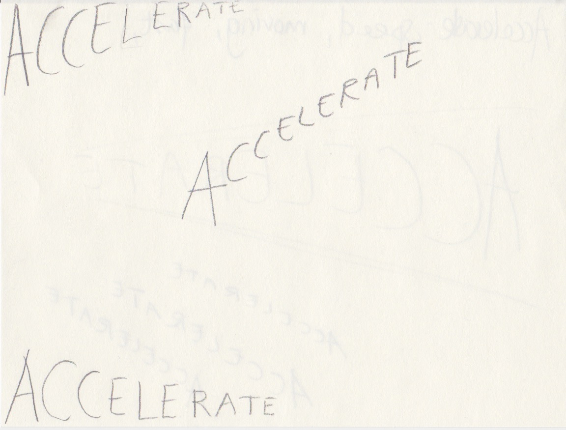 I wanted to make the word seem to actually speed up. I used baseline shift, while also making each letter smaller. A lot of doing and redoing, but I felt the result was okay. The typeface I used, again from Creative Cloud, was Aviano Future, and I ended up with Black Fast. All of the fonts from this typeface marked “fast” leaned to the right and felt appropriate for this word. I placed the word at the bottom of the page. Possibly a frame would have made that clearer, but as it wasn’t mentioned in the assignment, I left it like this.